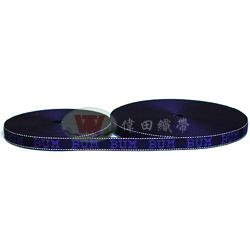 平紋提花帶 加兩條反光線 19mm*1.6mm 反光線於夜間反射光芒,易分辯及尋找物件,外觀增添美麗. 用於童車,手袋,箱包,背包,沙灘椅,服裝輔料,運動器材等.